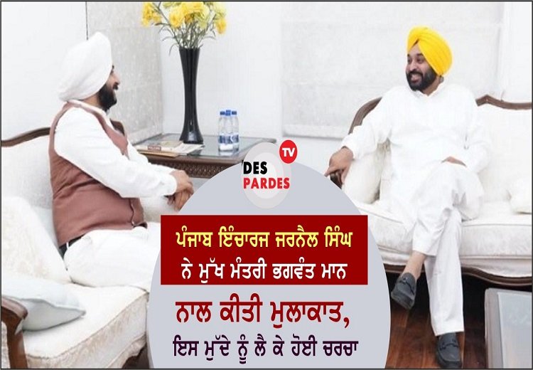 ਚੰਡੀਗੜ੍ਹ 8 ਅਪ੍ਰੈਲ 2022 : ਆਦਮੀ ਪਾਰਟੀ ਦੇ ਪੰਜਾਬ ਮਾਮਲਿਆਂ ਦੇ ਇੰਚਾਰਜ ਜਰਨੈਲ ਸਿੰਘ ਨੇ ਮੁੱਖ ਮੰਤਰੀ ਭਗਵੰਤ ਮਾਨ ਨਾਲ ਮੁਲਾਕਾਤ ਕੀਤੀ। ਇਸ ਦੌਰਾਨ ਉਨ੍ਹਾਂ ਨੇ ਪਾਰਟੀ ਦੀ ਰਣਨੀਤੀ ਬਾਰੇ ਵਿਚਾਰ-ਵਟਾਂਦਰਾ ਕੀਤਾ।