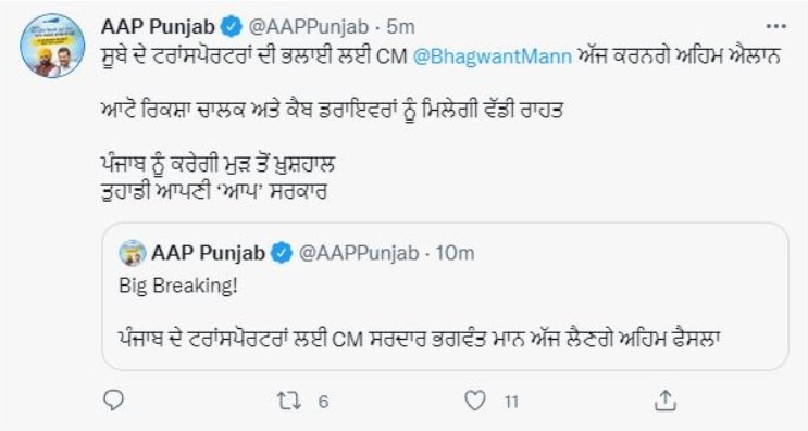 ਸਰਕਾਰ ਦੀ ਇਸ ਸਕੀਮ ਦਾ ਫਾਇਦਾ ਕੈਬ ਡਰਾਈਵਰਾਂ ਦੇ ਨਾਲ-ਨਾਲ ਆਟੋ ਰਿਕਸ਼ਾ ਚਾਲਕਾਂ ਤੇ ਸਕੂਲ ਡਰਾਈਵਰਾਂ ਨੂੰ ਵੀ ਹੋਵੇਗਾ। CM ਮਾਨ ਦੇ ਆਫੀਸ਼ੀਅਲੀ ਪੇਜ ‘ਤੇ ਟਵੀਟ ਕਰਕੇ ਕਿਹਾ ਗਿਆ ਹੈ ਕਿ ਸੂਬੇ ਦੇ ਟਰਾਂਸਪੋਰਟਰਾਂ ਦੀ ਭਲਾਈ ਲਈ ਮੁੱਖ ਮੰਤਰੀ ਮਾਨ ਅੱਜ ਕੋਈ ਅਹਿਮ ਐਲਾਨ ਕਰ ਸਕਦੇ ਹਨ। ਆਟੋ ਰਿਕਸ਼ਾ ਚਾਲਕਾਂ ਤੇ ਕੈਬ ਡਰਾਈਵਰਾਂ ਨੂੰ ਵੱਡੀ ਰਾਹਤ ਮਿਲ ਸਕਦੀ ਹੈ। ਪੰਜਾਬ ਨੂੰ ਕਰੇਗੀ ਮੁੜ ਤੋਂ ਖੁਸ਼ਹਾਲ, ਤੁਹਾਡੀ ਆਪਣੀ ‘ਆਪ’ ਸਰਕਾਰ।