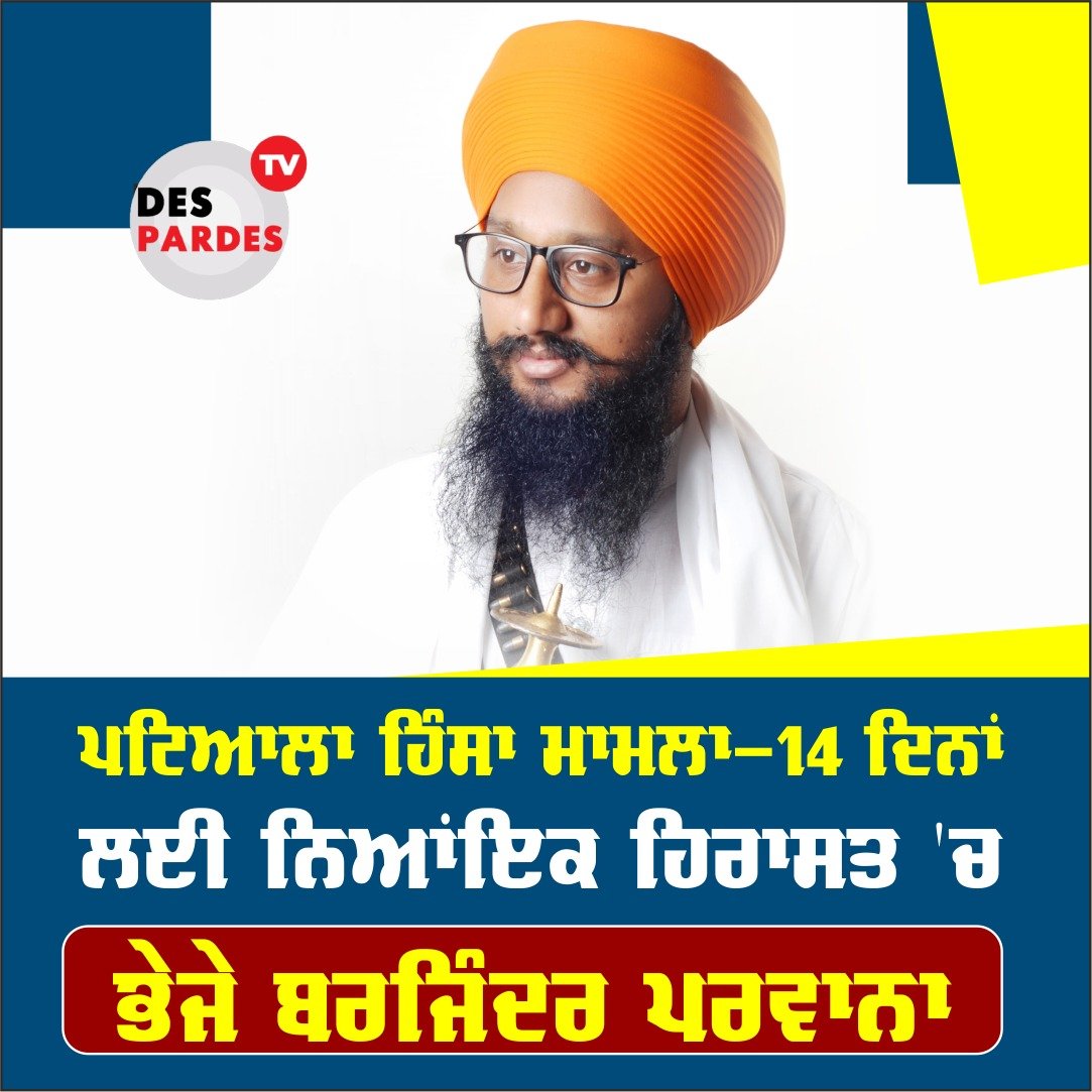 ਪਟਿਆਲਾ 9 ਮਈ 2022 : ਪਟਿਆਲਾ ਹਿੰਸਾ ਮਾਮਲੇ ‘ਚ ਮੁੱਖ ਮੁਲਜ਼ਮ ਬਰਜਿੰਦਰ ਸਿੰਘ ਪਰਵਾਨਾ ਨੂੰ ਸੋਮਵਾਰ ਨੂੰ ਪਟਿਆਲਾ ਪੁਲਸ ਵੱਲੋਂ ਅਦਾਲਤ ‘ਚ ਪੇਸ਼ ਕੀਤਾ ਗਿਆ। ਮਾਣਯੋਗ ਅਦਾਲਤ ਨੇ ਮਾਮਲੇ ਸਬੰਧੀ ਸੁਣਵਾਈ ਕਰਦੇ ਹੋਏ ਬਰਜਿੰਦਰ ਪਰਵਾਨਾ ਨੂੰ 14 ਦਿਨਾਂ ਦੀ ਨਿਆਇਕ ਹਿਰਾਸਤ ‘ਚ ਭੇਜ ਦਿੱਤਾ ਹੈ। ਇਸ ਤੋਂ ਪਹਿਲਾਂ ਅਦਾਲਤ ਵੱਲੋਂ ਬਰਜਿੰਦਰ ਸਿੰਘ ਪਰਵਾਨਾ ਨੂੰ 9 ਮਈ ਤੱਕ ਪੁਲਸ ਰਿਮਾਂਡ ‘ਤੇ ਭੇਜਿਆ ਗਿਆ ਸੀ।