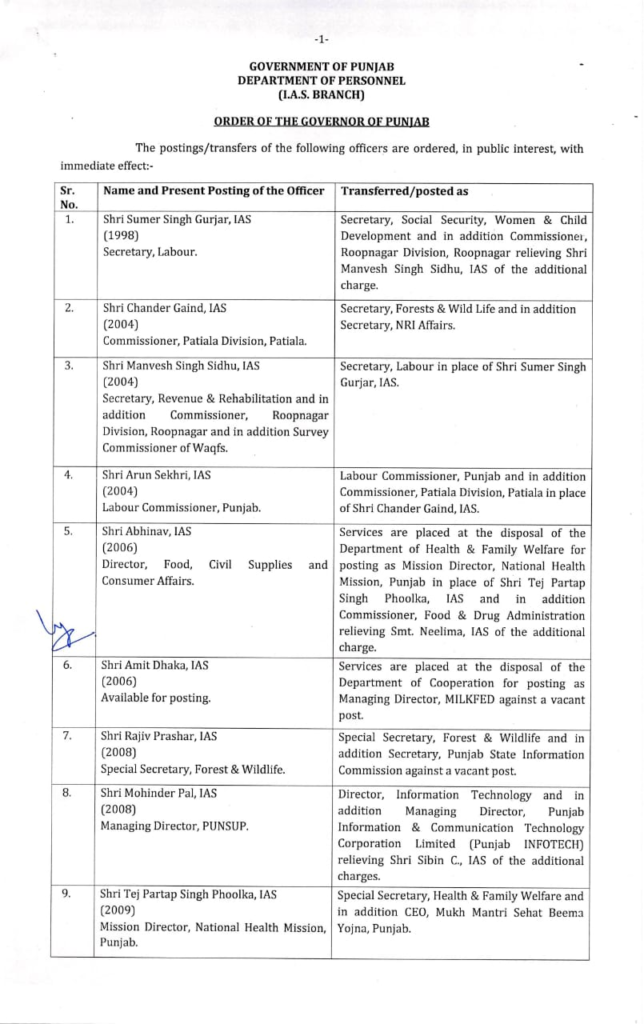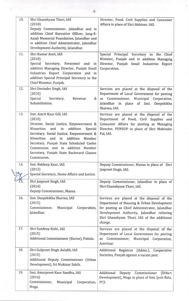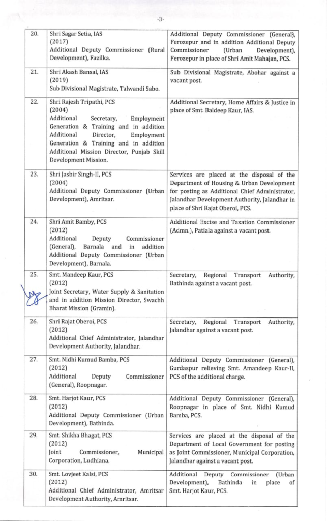 Breaking newsਦੋਆਬਾਪੰਜਾਬਮਾਝਾਮਾਲਵਾ ਪੰਜਾਬ ਸਰਕਾਰ ਵੱਲੋਂ 21 IAS ਤੇ 47 PCS ਅਧਿਕਾਰੀਆਂ ਦੇ ਹੋਏ ਤਬਾਦਲੇ, ਵੇਖੋ ਲਿਸਟ By redfm - July 8, 2022 0 101 FacebookTwitterPinterestWhatsApp ਚੰਡੀਗੜ੍ਹ 8 ਜੁਲਾਈ 2022 : ਪੰਜਾਬ ਸਰਕਾਰ ਵੱਲੋਂ ਅੱਜ ਵੱਡਾ ਪ੍ਰਸ਼ਾਸਨਿਕ ਫੇਰਬਦਲ ਕੀਤਾ ਗਿਆ ਹੈ। ਸਰਕਾਰ ਦੁਆਰਾ 68 ਆਈਏਐਸ ਅਤੇ ਐਚਸੀਐਸ ਅਧਿਕਾਰੀਆਂ ਦੇ ਤਬਾਦਲੇ ਕੀਤੇ ਗਏ ਹਨ, ਜਿਨ੍ਹਾਂ ਵਿੱਚ 21 ਆਈਏਐਸ ਅਤੇ 47 ਐਚਸੀਐਸ ਅਧਿਕਾਰੀ ਸ਼ਾਮਲ ਹਨ।