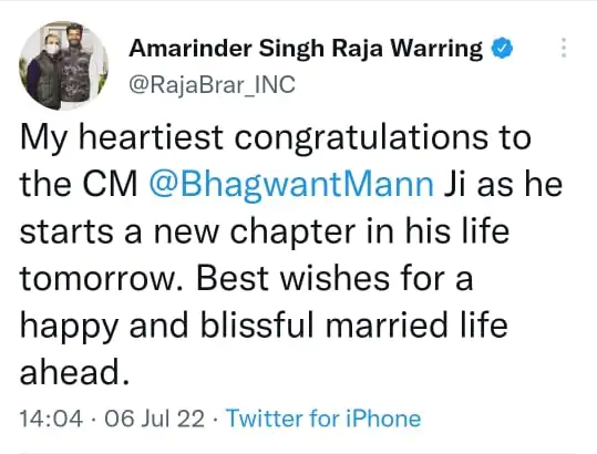 ਜਿਸ ਤੋਂ ਬਾਅਦ ਪੰਜਾਬ ਕਾਂਗਰਸ ਪ੍ਰਧਾਨ ਰਾਜਾ ਅਮਰਿੰਦਰ ਸਿੰਘ ਵੜਿੰਗ ਨੇ ਮੁੱਖ ਮੰਤਰੀ ਭਗਵੰਤ ਨੂੰ ਵਧਾਈਆਂ ਦਿੱਤੀਆਂ ਹਨ। ਉਨ੍ਹਾਂ ਨੇ ਟਵੀਟ ਕੀਤਾ ਹੈ ਕਿ ‘ਮੁੱਖ ਮੰਤਰੀ ਭਗਵੰਤ ਮਾਨ ਨੂੰ ਮੇਰੀਆਂ ਦਿਲੋਂ ਵਧਾਈਆਂ। ਜਿਵੇਂ ਕਿ ਉਹ ਕੱਲ੍ਹ ਆਪਣੀ ਜ਼ਿੰਦਗੀ ਵਿੱਚ ਇੱਕ ਨਵਾਂ ਅਧਿਆਏ ਸ਼ੁਰੂ ਕਰਨਗੇ। ਅੱਗੇ ਤੋਂ ਖੁਸ਼ਹਾਲ ਅਤੇ ਖੁਸ਼ਹਾਲ ਵਿਆਹੁਤਾ ਜੀਵਨ ਲਈ ਸ਼ੁੱਭ ਕਾਮਨਾਵਾਂ।’