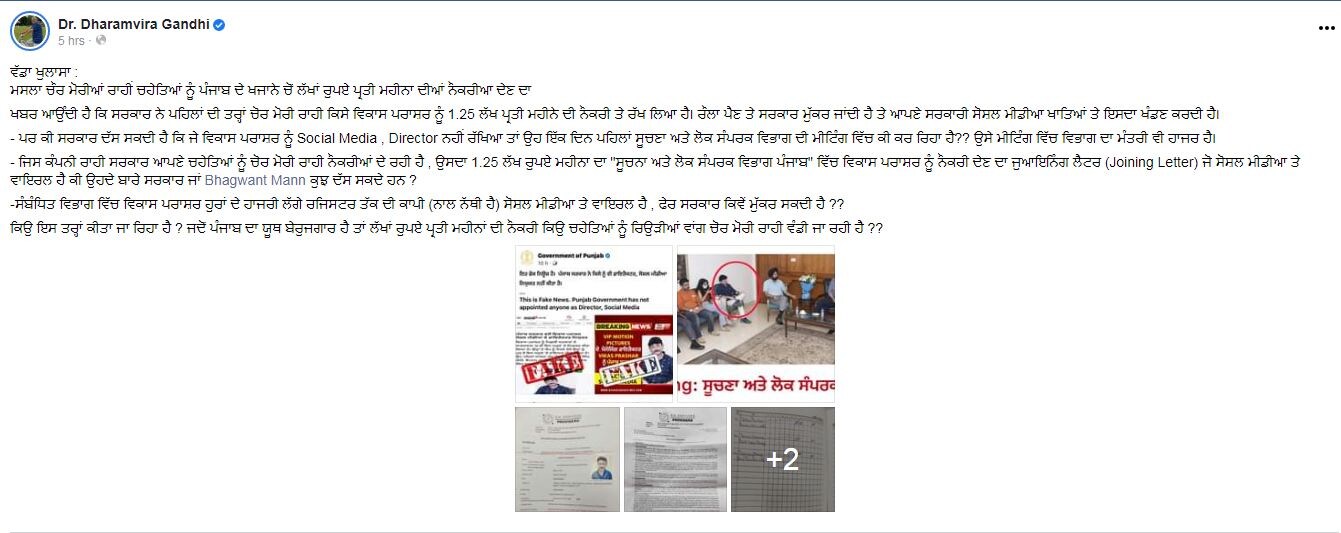ਦੱਸ ਦੇਈਏ ਕਿ ਬੀਤੇ ਦਿਨ ਵਿਕਾਸ ਪਰਾਸ਼ਰ ਨੂੰ ਪੰਜਾਬ ਸਰਕਾਰ ਵੱਲੋਂ ਡਾਇਰੈਕਟਰ ਸੋਸ਼ਲ ਮੀਡੀਆ ਨਿਯੁਕਤ ਕਰਨ ਬਾਰੇ ਕਈ ਮੀਡੀਆ ਅਦਾਰਿਆਂ ‘ਚ ਖ਼ਬਰ ਲੱਗੀ ਸੀ, ਜਿਸ ‘ਤੇ ਪੰਜਾਬ ਸਰਕਾਰ ਨੇ ਟਵੀਟ ਰਾਹੀਂ ਇਸ ਖ਼ਬਰ ਨੂੰ ‘ਜਾਅਲੀ ਖ਼ਬਰ’ ਦੱਸਿਆ ਸੀ।
